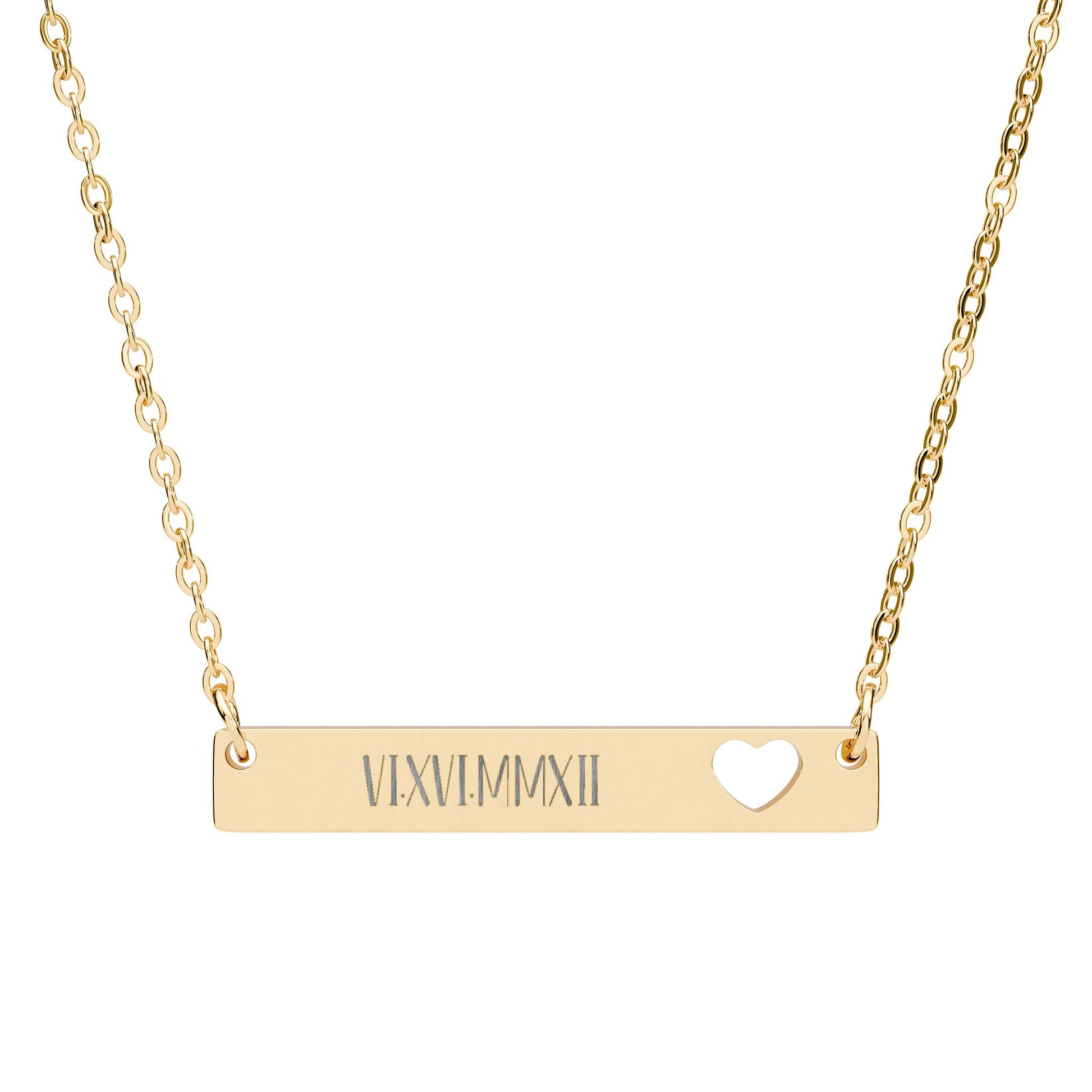This engraved Cutout Heart Bar Necklace is the perfect personalized accessory for commemorating special dates like anniversaries and weddings. The roman numerals add a timeless touch, making it a sentimental piece that fits seamlessly into any buyer's jewelry collection. Ideal for adults looking to celebrate love and milestones, this necklace is perfect for anniversary gifts, wedding favors, and special occasions.
